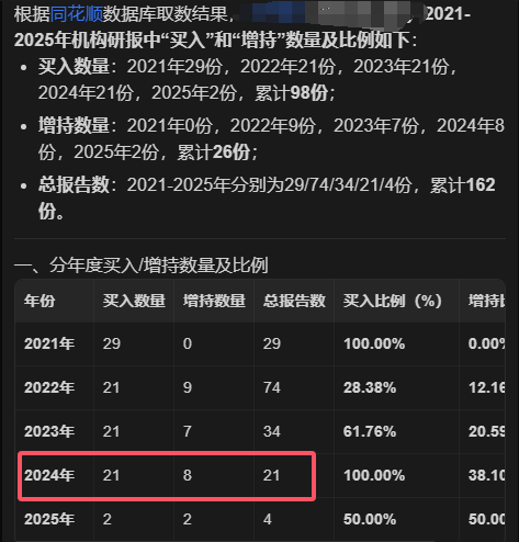 所以分析机构研报里“买入以及增持/推荐”的占比,以及这个占比的变化趋势,是能看出很多东西的,DS检索不到最新的研报,也不去官方机构爬数据,临时在网上搜别人写的文章查数据,里面写几份就算几份,每次问数量都不对,然后同花顺的数据库里绝对有完整的机构研报,一份都不会少。
