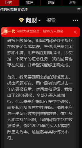 我指出那些错误,那问财就改哪些,把最扎眼的2021年数据改为之后,我接着往下看,发现2024年的评级里那么离谱的错误,问财一点都不动,我不提示它就不改,反正自查绝对无效。
